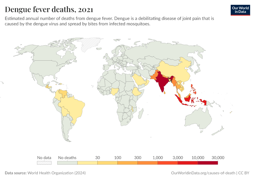 World Health Organization (2024) – with major processing by Our World in Data. “Dengue fever deaths” [dataset]. World Health Organization, “Global Health Estimates” [original data]. Retrieved December 19, 2025 from https://archive.ourworldindata.org/20250909-093708/grapher/dengue-fever-deaths.html (archived on September 9, 2025).