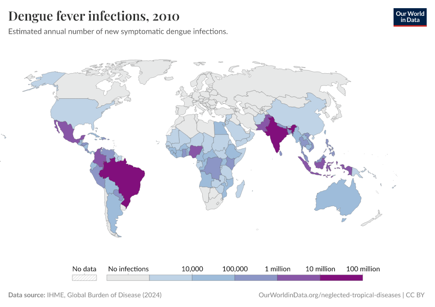IHME, Global Burden of Disease (2024) – with major processing by Our World in Data. “Dengue fever infections” [dataset]. IHME, Global Burden of Disease, “Global Burden of Disease - Prevalence and Incidence” [original data]. Retrieved December 7, 2025 from https://archive.ourworldindata.org/20251001-144546/grapher/dengue-incidence.html (archived on October 1, 2025).