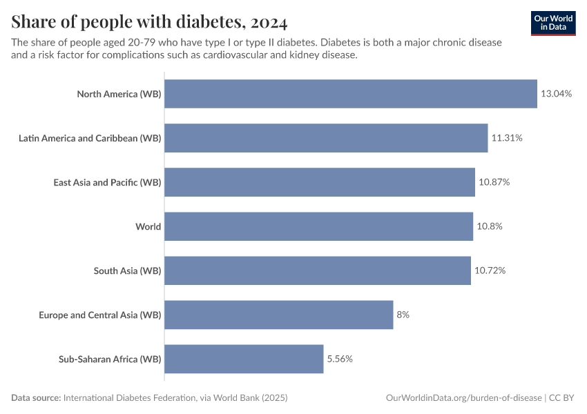 International Diabetes Federation, via World Bank (2025) – processed by Our World in Data. “Share of people with diabetes” [dataset]. International Diabetes Federation, via World Bank, “World Development Indicators 122” [original data]. Retrieved December 5, 2025 from https://archive.ourworldindata.org/20251022-091218/grapher/diabetes-prevalence.html (archived on October 22, 2025).