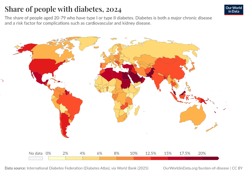 “Data Page: Share of people with diabetes”. Our World in Data (2026). Data adapted from International Diabetes Federation (Diabetes Atlas), via World Bank. Retrieved from https://archive.ourworldindata.org/20251220-152415/grapher/diabetes-prevalence.html [online resource] (archived on December 20, 2025).