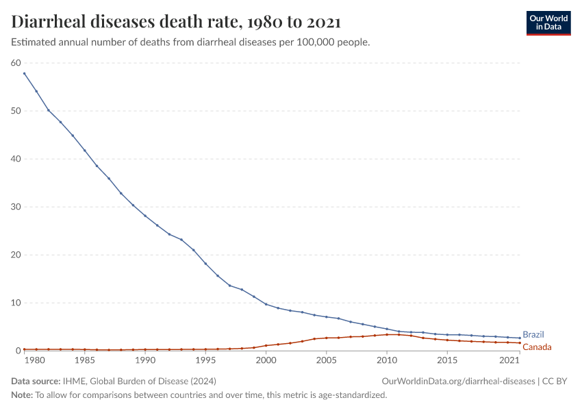 “Data Page: Diarrheal diseases death rate”, part of the following publication: Esteban Ortiz-Ospina and Max Roser (2016) - “Global Health”. Data adapted from IHME, Global Burden of Disease. Retrieved from https://archive.ourworldindata.org/20250909-093708/grapher/diarrheal-disease-death-rates.html [online resource] (archived on September 9, 2025).