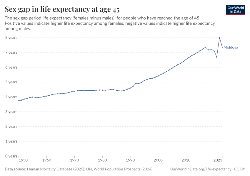 Human Mortality Database (2025); UN, World Population Prospects (2024) – with major processing by Our World in Data. “Life expectancy at 45 – HMD – female-male difference, period tables” [dataset]. Human Mortality Database, “Human Mortality Database”; United Nations, “World Population Prospects” [original data]. Retrieved December 5, 2025 from https://archive.ourworldindata.org/20251022-222946/grapher/difference-in-female-and-male-life-expectancy-at-age-45.html (archived on October 22, 2025).