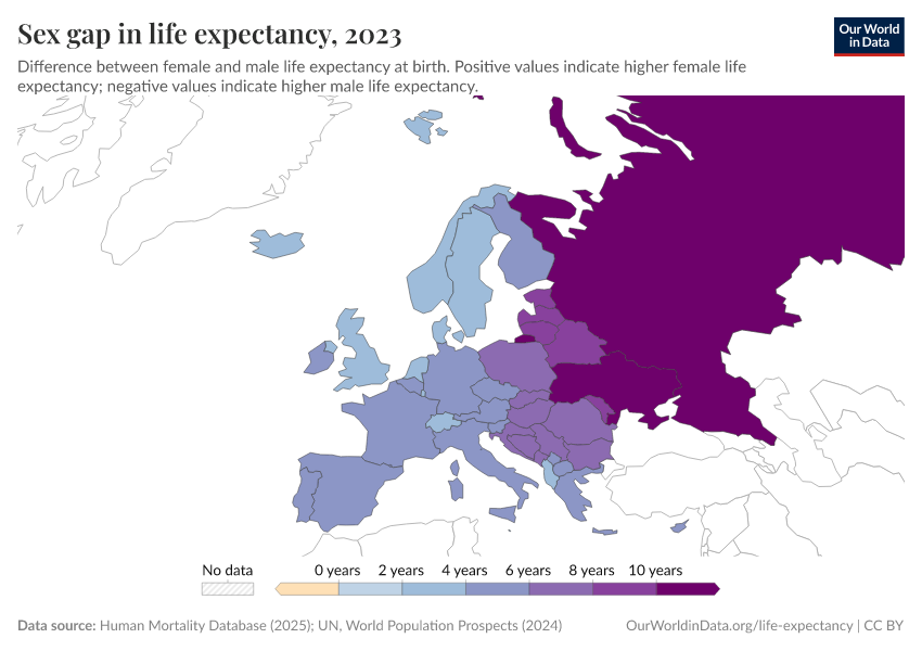 “Data Page: Life expectancy at birth”, part of the following publication: Saloni Dattani, Lucas Rodés-Guirao, Hannah Ritchie, Esteban Ortiz-Ospina, and Max Roser (2023) - “Life Expectancy”. Data adapted from Human Mortality Database, United Nations. Retrieved from https://archive.ourworldindata.org/20251022-222946/grapher/difference-in-female-and-male-life-expectancy-at-birth.html [online resource] (archived on October 22, 2025).How to cite this data