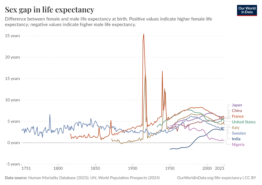 Human Mortality Database (2025); UN, World Population Prospects (2024) – with major processing by Our World in Data. “Life expectancy at birth – HMD – female-male difference, period tables” [dataset]. Human Mortality Database, “Human Mortality Database”; United Nations, “World Population Prospects” [original data]. Retrieved April 2, 2026 from https://archive.ourworldindata.org/20260304-094028/grapher/difference-in-female-and-male-life-expectancy-at-birth.html (archived on March 4, 2026).Download