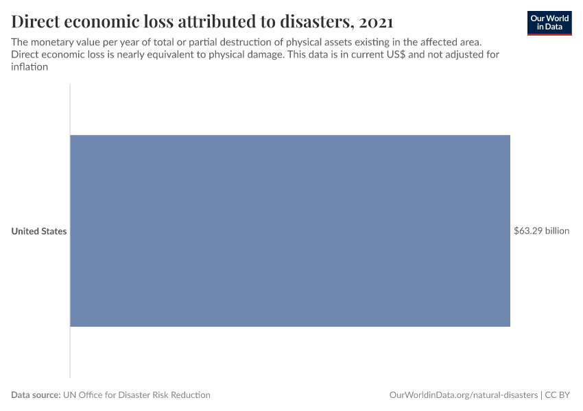 “Data Page: Direct economic loss attributed to disasters”. Our World in Data (2025). Data adapted from UN Office for Disaster Risk Reduction. Retrieved from https://archive.ourworldindata.org/20251121-151713/grapher/direct-economic-loss-attributed-to-disasters.html [online resource] (archived on November 21, 2025).How to cite this data