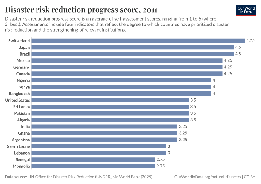 “Data Page: Disaster risk reduction progress score”. Our World in Data (2025). Data adapted from UN Office for Disaster Risk Reduction (UNDRR), via World Bank. Retrieved from https://archive.ourworldindata.org/20250916-102301/grapher/disaster-risk-reduction-progress.html [online resource] (archived on September 16, 2025).How to cite this data