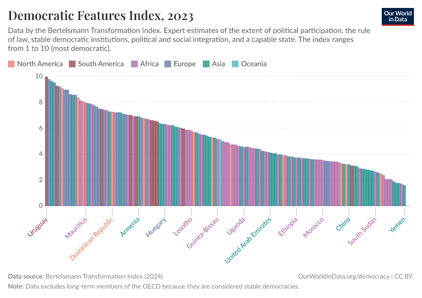 “Data Page: Democratic Features Index”, part of the following publication: Bastian Herre, Lucas Rodés-Guirao, and Esteban Ortiz-Ospina (2013) - “Democracy”. Data adapted from Bertelsmann Transformation Index. Retrieved from https://archive.ourworldindata.org/20251209-133038/grapher/democratic-features-bti.html [online resource] (archived on December 9, 2025).How to cite this data