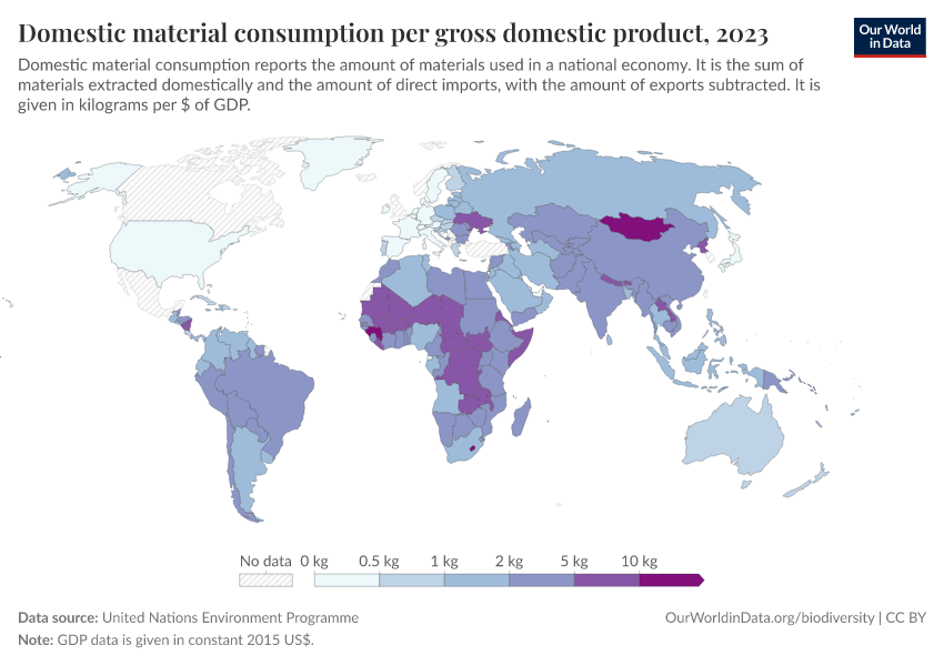 United Nations Environment Programme – processed by Our World in Data. “Domestic material consumption per gross domestic product” [dataset]. United Nations Environment Programme, “WESR / Global Material Flows Database” [original data]. Retrieved January 14, 2026 from https://archive.ourworldindata.org/20260105-133053/grapher/domestic-material-consumption-per-unit-of-gdp.html (archived on January 5, 2026).