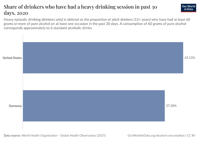“Data Page: Share of drinkers who have had a heavy drinking session in past 30 days”. Our World in Data (2026). Data adapted from World Health Organization. Retrieved from https://archive.ourworldindata.org/20250909-093708/grapher/drinkers-had-a-heavy-session-in-past-30-days.html [online resource] (archived on September 9, 2025).How to cite this data