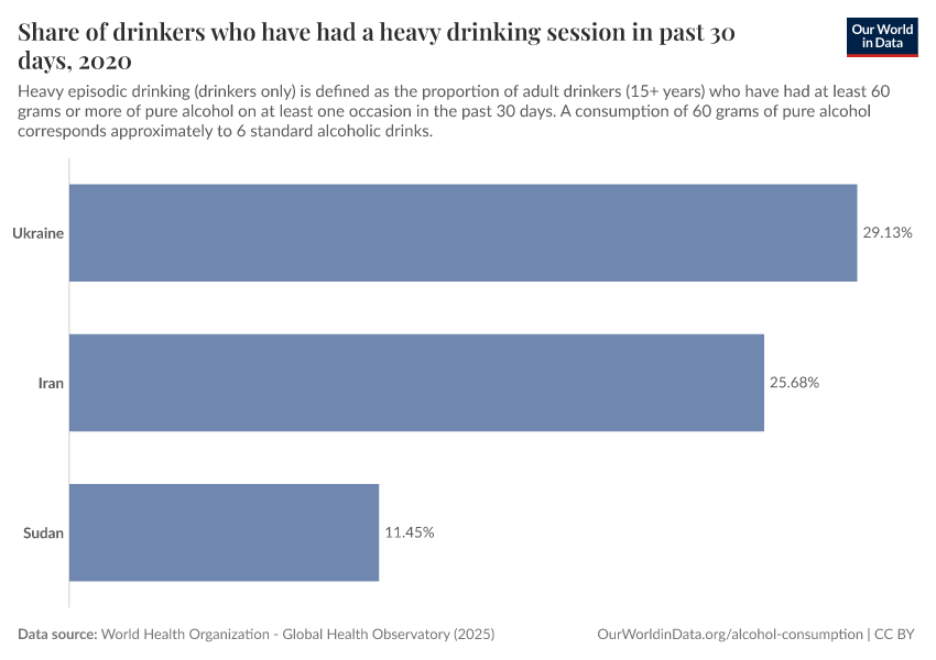 World Health Organization - Global Health Observatory (2025) – processed by Our World in Data. “Share of drinkers who have had a heavy drinking session in past 30 days” [dataset]. World Health Organization, “Global Health Observatory” [original data]. Retrieved April 30, 2026 from https://archive.ourworldindata.org/20260417-112857/grapher/drinkers-had-a-heavy-session-in-past-30-days.html (archived on April 17, 2026).Download