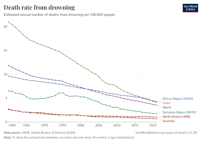 IHME, Global Burden of Disease (2024) – with minor processing by Our World in Data. “Death rate from drowning” [dataset]. IHME, Global Burden of Disease, “Global Burden of Disease - Deaths and DALYs” [original data]. Retrieved January 16, 2026 from https://archive.ourworldindata.org/20250909-093708/grapher/drowning-death-rates.html (archived on September 9, 2025).