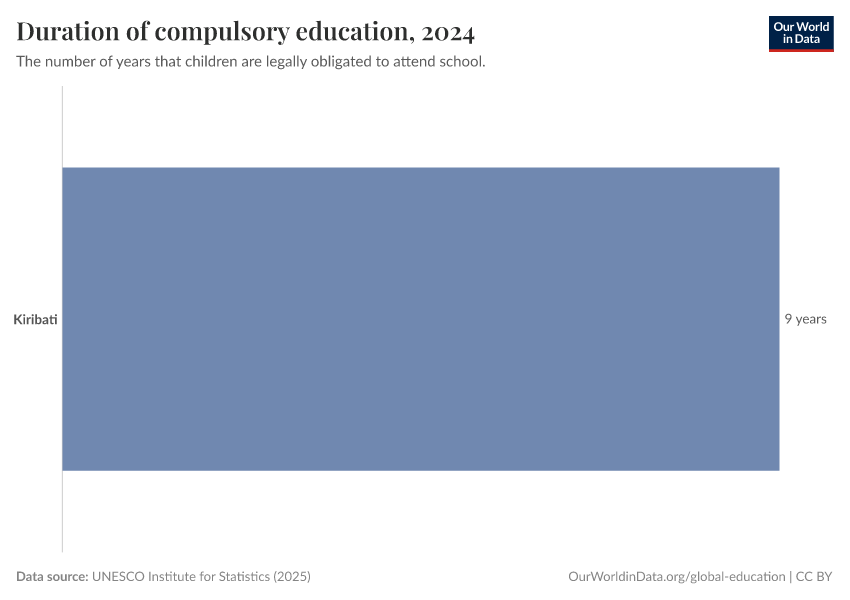 UNESCO Institute for Statistics (2025) – with minor processing by Our World in Data. “Duration of compulsory education” [dataset]. UNESCO Institute for Statistics, “UNESCO Institute for Statistics (UIS) - Education” [original data]. Retrieved December 10, 2025 from https://archive.ourworldindata.org/20250909-093708/grapher/duration-of-compulsory-education.html (archived on September 9, 2025).
