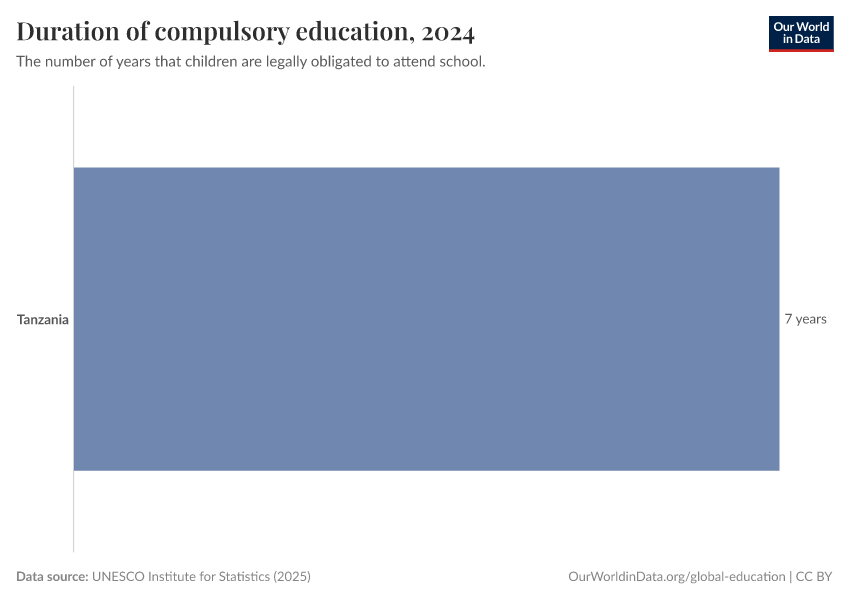 “Data Page: Duration of compulsory education”, part of the following publication: Hannah Ritchie, Veronika Samborska, Natasha Ahuja, Esteban Ortiz-Ospina, and Max Roser (2023) - “Global Education”. Data adapted from UNESCO Institute for Statistics. Retrieved from https://archive.ourworldindata.org/20250909-093708/grapher/duration-of-compulsory-education.html [online resource] (archived on September 9, 2025).How to cite this data