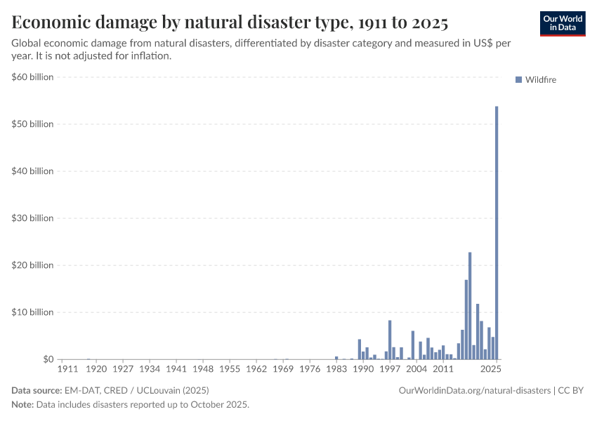 EM-DAT, CRED / UCLouvain (2025) – with major processing by Our World in Data. “Economic damage by natural disaster type – EM-DAT” [dataset]. EM-DAT, “The International Disasters Database” [original data]. Retrieved January 31, 2026 from https://archive.ourworldindata.org/20260112-111535/grapher/economic-damage-from-natural-disasters.html (archived on January 12, 2026).