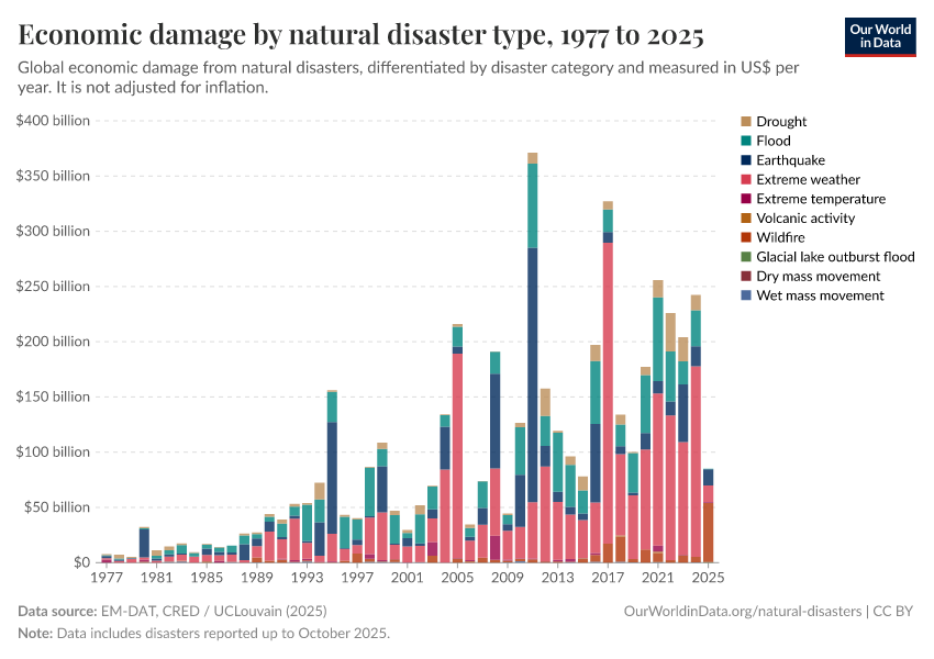 EM-DAT, CRED / UCLouvain (2025) – with major processing by Our World in Data. “Economic damage by natural disaster type – EM-DAT” [dataset]. EM-DAT, CRED / UCLouvain, “Natural disasters” [original data]. Retrieved December 5, 2025 from https://archive.ourworldindata.org/20251126-143026/grapher/economic-damage-from-natural-disasters.html (archived on November 26, 2025).