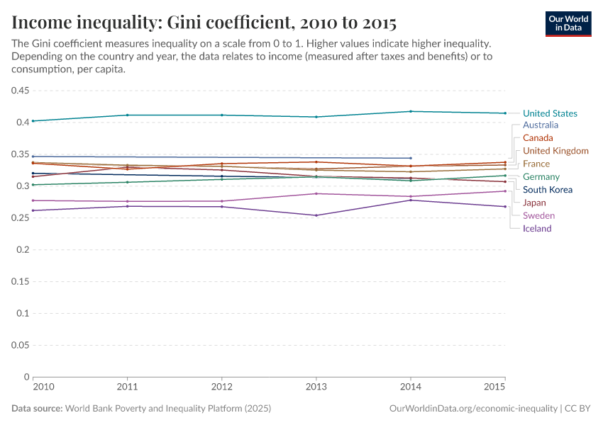 World Bank Poverty and Inequality Platform (2025) – with major processing by Our World in Data. “Income inequality: Gini coefficient – World Bank” [dataset]. World Bank Poverty and Inequality Platform, “World Bank Poverty and Inequality Platform (PIP) 20250930_2021, 20250930_2017” [original data]. Retrieved December 5, 2025 from https://archive.ourworldindata.org/20251030-150736/grapher/economic-inequality-gini-index.html (archived on October 30, 2025).