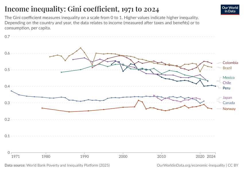 “Data Page: Income inequality: Gini coefficient”, part of the following publication: Joe Hasell, Bertha Rohenkohl, Pablo Arriagada, Esteban Ortiz-Ospina, and Max Roser (2023) - “Economic Inequality”. Data adapted from World Bank Poverty and Inequality Platform. Retrieved from https://archive.ourworldindata.org/20260325-171315/grapher/economic-inequality-gini-index.html [online resource] (archived on March 25, 2026).How to cite this data