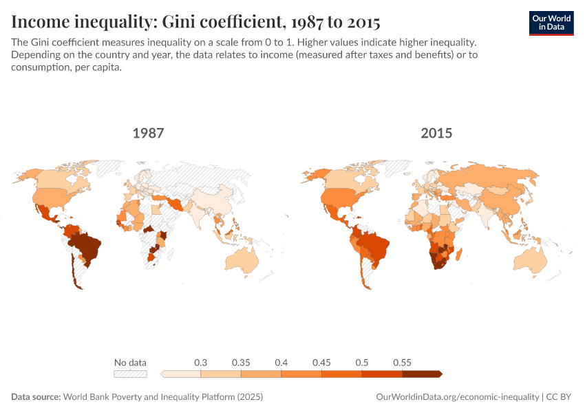 World Bank Poverty and Inequality Platform (2025) – with major processing by Our World in Data. “Income inequality: Gini coefficient – World Bank” [dataset]. World Bank Poverty and Inequality Platform, “World Bank Poverty and Inequality Platform (PIP) 20250930_2021, 20250930_2017” [original data]. Retrieved April 3, 2026 from https://archive.ourworldindata.org/20260325-171315/grapher/economic-inequality-gini-index.html (archived on March 25, 2026).Download
