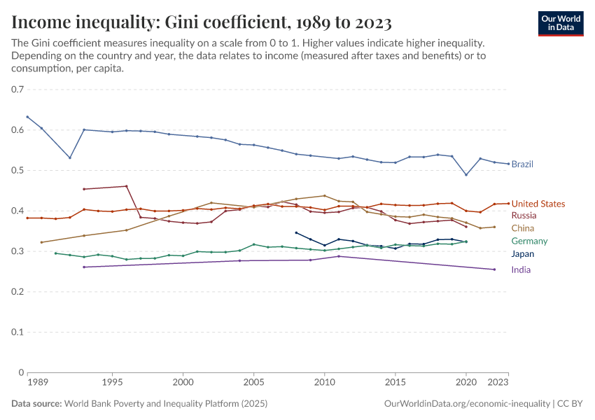 “Data Page: Income inequality: Gini coefficient”, part of the following publication: Joe Hasell, Bertha Rohenkohl, Pablo Arriagada, Esteban Ortiz-Ospina, and Max Roser (2023) - “Economic Inequality”. Data adapted from World Bank Poverty and Inequality Platform. Retrieved from https://archive.ourworldindata.org/20251209-133038/grapher/economic-inequality-gini-index.html [online resource] (archived on December 9, 2025).How to cite this data