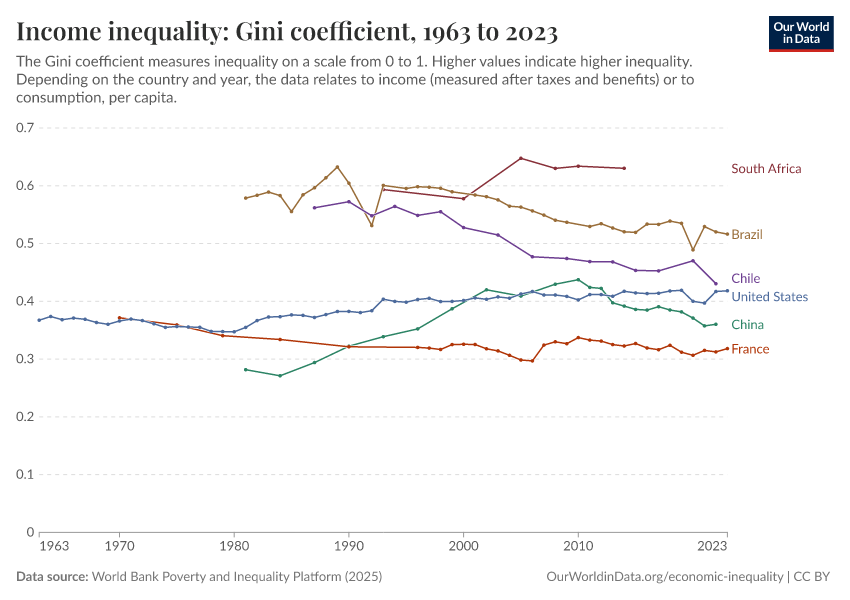 “Data Page: Income inequality: Gini coefficient”, part of the following publication: Joe Hasell, Bertha Rohenkohl, Pablo Arriagada, Esteban Ortiz-Ospina, and Max Roser (2023) - “Economic Inequality”. Data adapted from World Bank Poverty and Inequality Platform. Retrieved from https://archive.ourworldindata.org/20260121-181704/grapher/economic-inequality-gini-index.html [online resource] (archived on January 21, 2026).How to cite this data