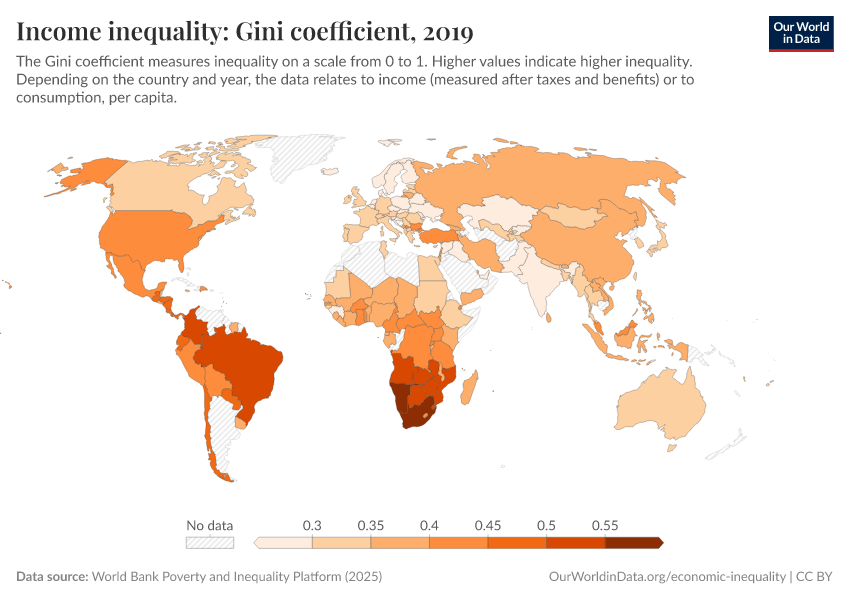 World Bank Poverty and Inequality Platform (2025) – with major processing by Our World in Data. “Income inequality: Gini coefficient – World Bank” [dataset]. World Bank Poverty and Inequality Platform, “World Bank Poverty and Inequality Platform (PIP) 20250930_2021, 20250930_2017” [original data]. Retrieved January 3, 2026 from https://archive.ourworldindata.org/20251209-133038/grapher/economic-inequality-gini-index.html (archived on December 9, 2025).