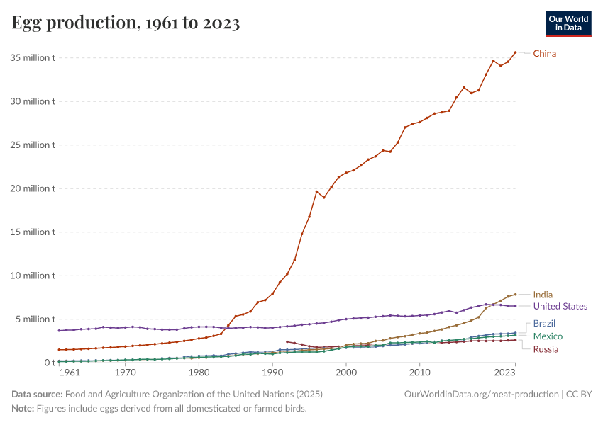 Food and Agriculture Organization of the United Nations (2025) – with major processing by Our World in Data. “Egg production – UN FAO” [dataset]. Food and Agriculture Organization of the United Nations, “Production: Crops and livestock products” [original data]. Retrieved December 7, 2025 from https://archive.ourworldindata.org/20251014-161652/grapher/egg-production-thousand-tonnes.html (archived on October 14, 2025).