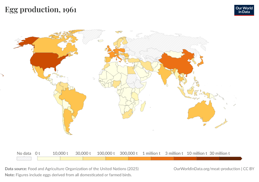 Food and Agriculture Organization of the United Nations (2025) – with major processing by Our World in Data. “Egg production – UN FAO” [dataset]. Food and Agriculture Organization of the United Nations, “Production: Crops and livestock products” [original data]. Retrieved January 5, 2026 from https://archive.ourworldindata.org/20251014-161652/grapher/egg-production-thousand-tonnes.html (archived on October 14, 2025).