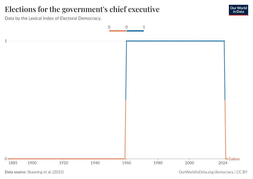 Skaaning et al. (2025) – processed by Our World in Data. “Elections for the government's chief executive” [dataset]. Skaaning et al., “Lexical Index of Electoral Democracy (LIED) v6.8” [original data]. Retrieved January 5, 2026 from https://archive.ourworldindata.org/20250909-093708/grapher/elections-for-the-governments-chief-executive.html (archived on September 9, 2025).
