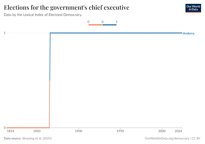 Skaaning et al. (2025) – processed by Our World in Data. “Elections for the government's chief executive” [dataset]. Skaaning et al., “Lexical Index of Electoral Democracy (LIED) v6.8” [original data]. Retrieved December 27, 2025 from https://archive.ourworldindata.org/20250909-093708/grapher/elections-for-the-governments-chief-executive.html (archived on September 9, 2025).