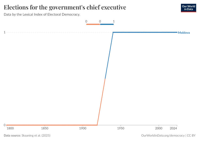 Skaaning et al. (2025) – processed by Our World in Data. “Elections for the government's chief executive” [dataset]. Skaaning et al., “Lexical Index of Electoral Democracy (LIED) v6.8” [original data]. Retrieved January 1, 2026 from https://archive.ourworldindata.org/20250909-093708/grapher/elections-for-the-governments-chief-executive.html (archived on September 9, 2025).