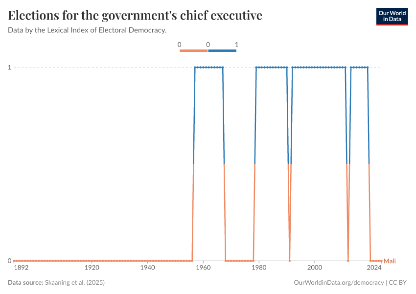 Skaaning et al. (2025) – processed by Our World in Data. “Elections for the government's chief executive” [dataset]. Skaaning et al., “Lexical Index of Electoral Democracy (LIED) v6.8” [original data]. Retrieved December 30, 2025 from https://archive.ourworldindata.org/20250909-093708/grapher/elections-for-the-governments-chief-executive.html (archived on September 9, 2025).