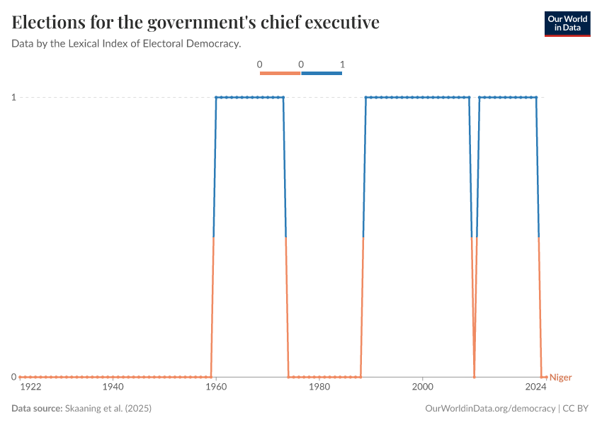 Skaaning et al. (2025) – processed by Our World in Data. “Elections for the government's chief executive” [dataset]. Skaaning et al., “Lexical Index of Electoral Democracy (LIED) v6.8” [original data]. Retrieved January 2, 2026 from https://archive.ourworldindata.org/20250909-093708/grapher/elections-for-the-governments-chief-executive.html (archived on September 9, 2025).