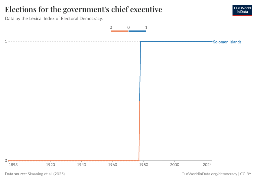 Skaaning et al. (2025) – processed by Our World in Data. “Elections for the government's chief executive” [dataset]. Skaaning et al., “Lexical Index of Electoral Democracy (LIED) v6.8” [original data]. Retrieved December 28, 2025 from https://archive.ourworldindata.org/20250909-093708/grapher/elections-for-the-governments-chief-executive.html (archived on September 9, 2025).