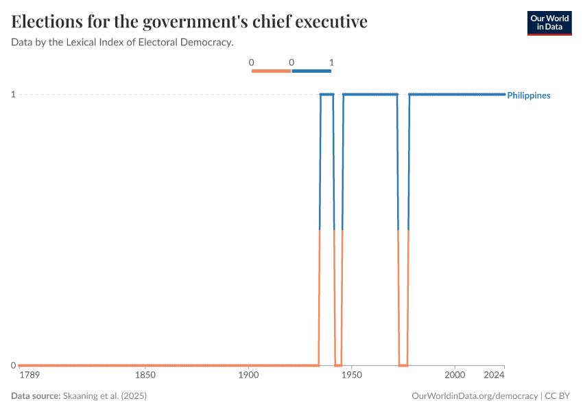 Skaaning et al. (2025) – processed by Our World in Data. “Elections for the government's chief executive” [dataset]. Skaaning et al., “Lexical Index of Electoral Democracy (LIED) v6.8” [original data]. Retrieved November 14, 2025 from https://archive.ourworldindata.org/20250909-093708/grapher/elections-for-the-governments-chief-executive.html (archived on September 9, 2025).