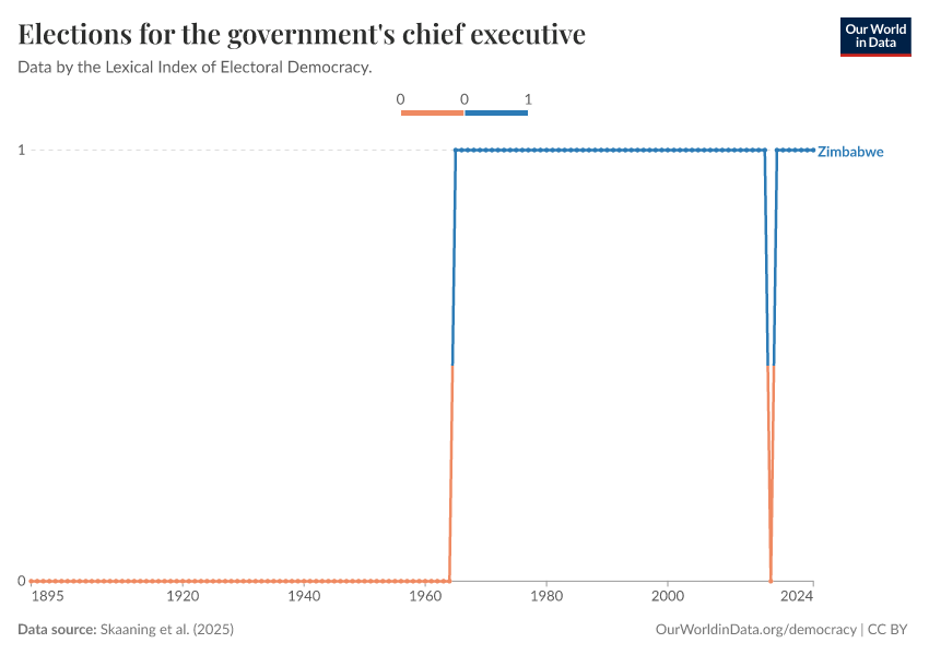 Skaaning et al. (2025) – processed by Our World in Data. “Elections for the government's chief executive” [dataset]. Skaaning et al., “Lexical Index of Electoral Democracy (LIED) v6.8” [original data]. Retrieved December 14, 2025 from https://archive.ourworldindata.org/20250909-093708/grapher/elections-for-the-governments-chief-executive.html (archived on September 9, 2025).