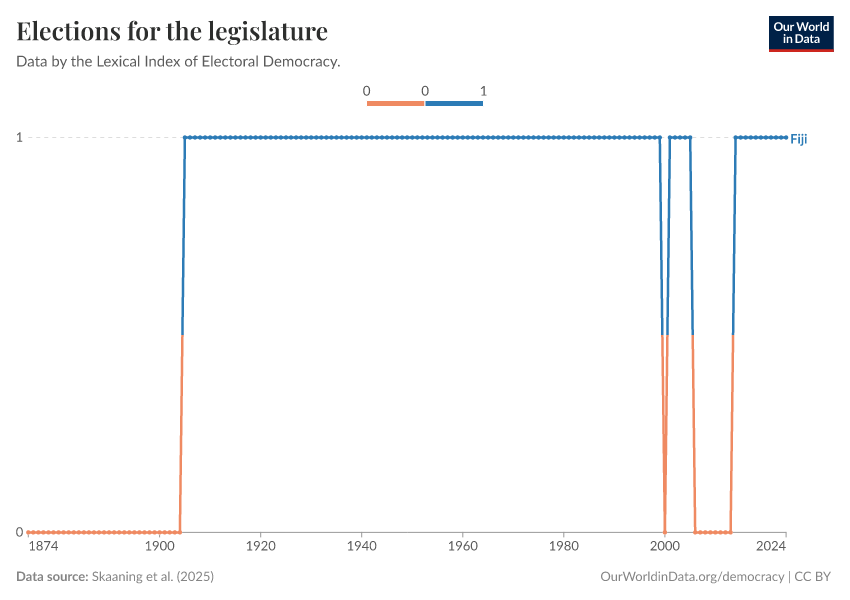 Skaaning et al. (2025) – processed by Our World in Data. “Elections for the legislature” [dataset]. Skaaning et al., “Lexical Index of Electoral Democracy (LIED) v6.8” [original data]. Retrieved November 9, 2025 from https://archive.ourworldindata.org/20250909-093708/grapher/elections-legislature-lexical.html (archived on September 9, 2025).