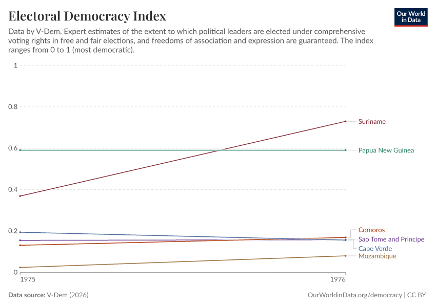 “Data Page: Electoral democracy index”, part of the following publication: Bastian Herre, Lucas Rodés-Guirao, and Esteban Ortiz-Ospina (2013) - “Democracy”. Data adapted from V-Dem. Retrieved from https://archive.ourworldindata.org/20260417-112857/grapher/electoral-democracy-index.html [online resource] (archived on April 17, 2026).How to cite this data