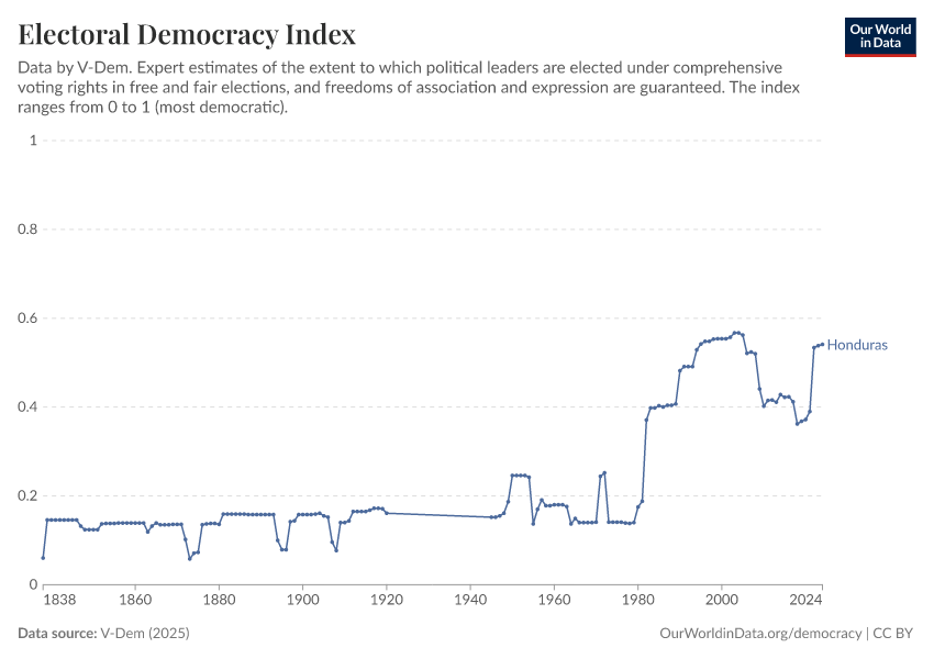 “Data Page: Electoral democracy index”, part of the following publication: Bastian Herre, Lucas Rodés-Guirao, and Esteban Ortiz-Ospina (2013) - “Democracy”. Data adapted from V-Dem. Retrieved from https://archive.ourworldindata.org/20260105-133053/grapher/electoral-democracy-index.html [online resource] (archived on January 5, 2026).