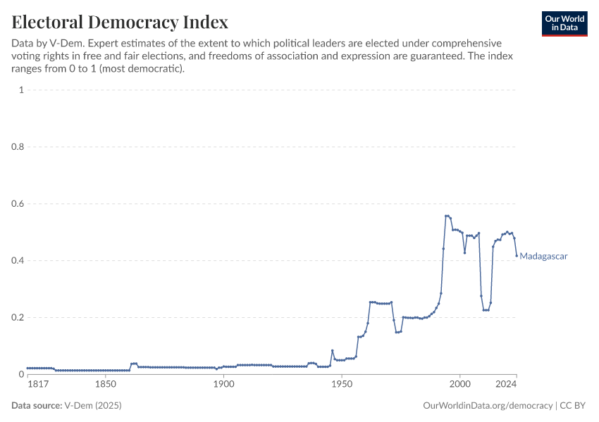 “Data Page: Electoral democracy index”, part of the following publication: Bastian Herre, Lucas Rodés-Guirao, and Esteban Ortiz-Ospina (2013) - “Democracy”. Data adapted from V-Dem. Retrieved from https://archive.ourworldindata.org/20260105-133053/grapher/electoral-democracy-index.html [online resource] (archived on January 5, 2026).