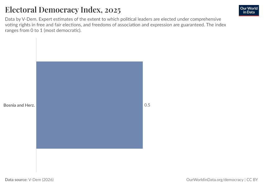 “Data Page: Electoral democracy index”, part of the following publication: Bastian Herre, Lucas Rodés-Guirao, and Esteban Ortiz-Ospina (2013) - “Democracy”. Data adapted from V-Dem. Retrieved from https://archive.ourworldindata.org/20260402-164039/grapher/electoral-democracy-index.html [online resource] (archived on April 2, 2026).How to cite this data