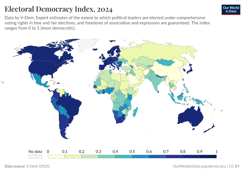 “Data Page: Electoral democracy index”, part of the following publication: Bastian Herre, Lucas Rodés-Guirao, and Esteban Ortiz-Ospina (2013) - “Democracy”. Data adapted from V-Dem. Retrieved from https://archive.ourworldindata.org/20251127-170114/grapher/electoral-democracy-index.html [online resource] (archived on November 27, 2025).How to cite this data