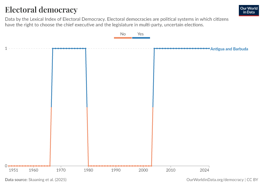 Skaaning et al. (2025) – processed by Our World in Data. “Electoral democracy” [dataset]. Skaaning et al., “Lexical Index of Electoral Democracy (LIED) v6.8” [original data]. Retrieved January 7, 2026 from https://archive.ourworldindata.org/20250909-093708/grapher/electoral-democracy-lexical.html (archived on September 9, 2025).