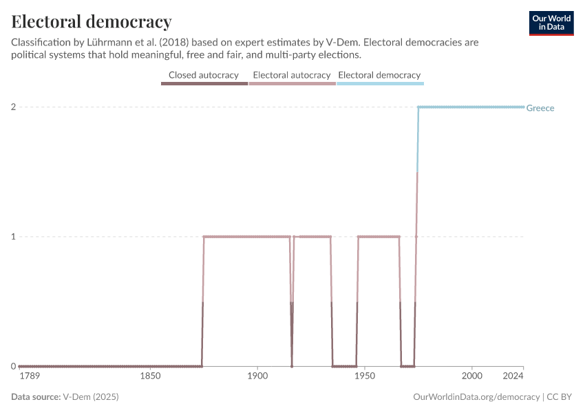 “Data Page: Political regime”, part of the following publication: Bastian Herre, Lucas Rodés-Guirao, and Esteban Ortiz-Ospina (2013) - “Democracy”. Data adapted from V-Dem. Retrieved from https://archive.ourworldindata.org/20250909-093708/grapher/electoral-democracy-row.html [online resource] (archived on September 9, 2025).How to cite this data