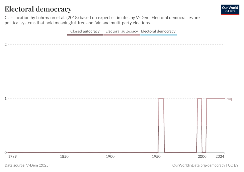 “Data Page: Political regime”, part of the following publication: Bastian Herre, Lucas Rodés-Guirao, and Esteban Ortiz-Ospina (2013) - “Democracy”. Data adapted from V-Dem. Retrieved from https://archive.ourworldindata.org/20250909-093708/grapher/electoral-democracy-row.html [online resource] (archived on September 9, 2025).How to cite this data