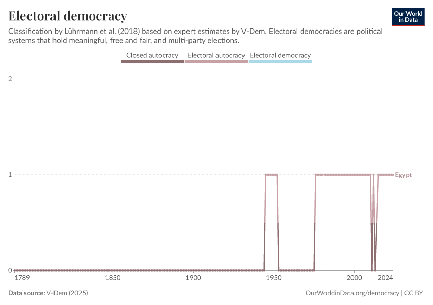 “Data Page: Political regime”, part of the following publication: Bastian Herre, Lucas Rodés-Guirao, and Esteban Ortiz-Ospina (2013) - “Democracy”. Data adapted from V-Dem. Retrieved from https://archive.ourworldindata.org/20260119-070102/grapher/electoral-democracy-row.html [online resource] (archived on January 19, 2026).How to cite this data