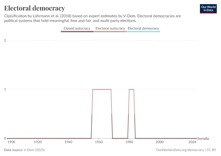 “Data Page: Political regime”, part of the following publication: Bastian Herre, Lucas Rodés-Guirao, and Esteban Ortiz-Ospina (2013) - “Democracy”. Data adapted from V-Dem. Retrieved from https://archive.ourworldindata.org/20250909-093708/grapher/electoral-democracy-row.html [online resource] (archived on September 9, 2025).How to cite this data