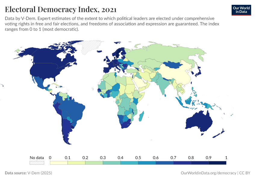 “Data Page: Electoral democracy index”, part of the following publication: Bastian Herre, Lucas Rodés-Guirao, and Esteban Ortiz-Ospina (2013) - “Democracy”. Data adapted from V-Dem. Retrieved from https://archive.ourworldindata.org/20251209-133038/grapher/electoral-democracy-index.html [online resource] (archived on December 9, 2025).