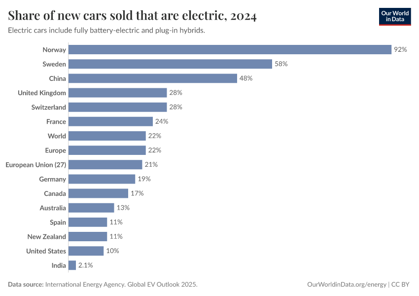“Data Page: Share of new cars sold that are electric”. Our World in Data (2026). Data adapted from International Energy Agency. Global EV Outlook 2025.. Retrieved from https://archive.ourworldindata.org/20260304-094028/grapher/electric-car-sales-share.html [online resource] (archived on March 4, 2026).How to cite this data