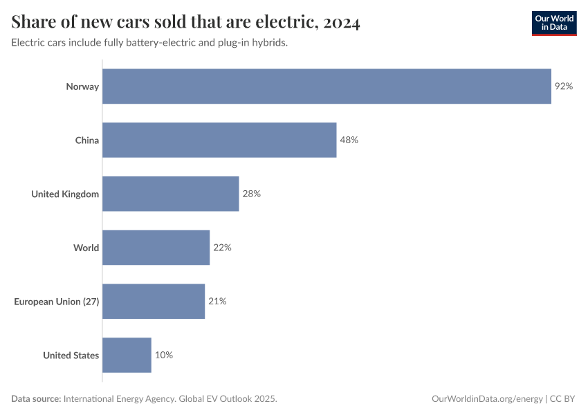 “Data Page: Share of new cars sold that are electric”. Our World in Data (2025). Data adapted from International Energy Agency. Global EV Outlook 2025.. Retrieved from https://archive.ourworldindata.org/20250909-093708/grapher/electric-car-sales-share.html [online resource] (archived on September 9, 2025).How to cite this data