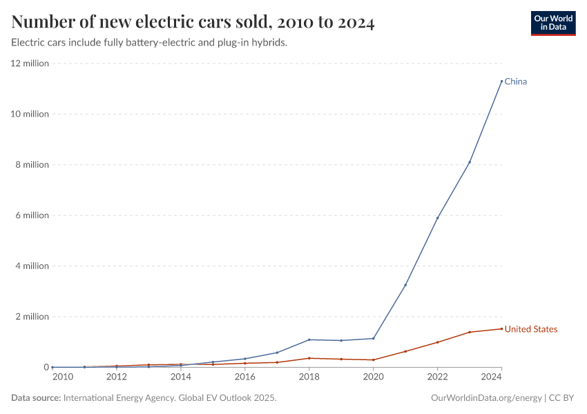 “Data Page: Number of new electric cars sold”. Our World in Data (2025). Data adapted from International Energy Agency. Global EV Outlook 2025.. Retrieved from https://archive.ourworldindata.org/20250909-093708/grapher/electric-car-sales.html [online resource] (archived on September 9, 2025).How to cite this data